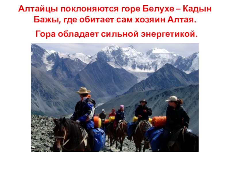 Слайд 12Алтайцы поклоняются горе Белухе – Кадын Бажы, где обитает сам хозяин