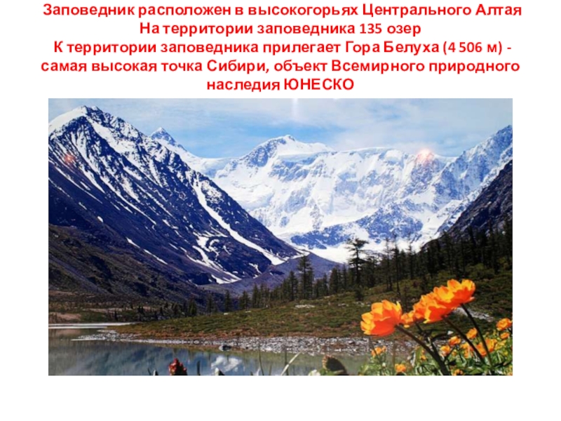 Слайд 11 Заповедник расположен в высокогорьях Центрального Алтая На территории заповедника 135 озер