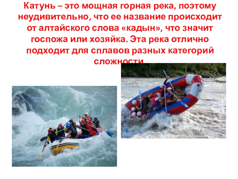происходит от алтайского слова «кадын», что значит госпожа или хозяйка. Эта река отлично подходит для сплавов разных категорий сложности.