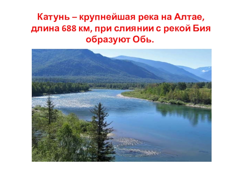 Катунь – крупнейшая река на Алтае,  длина 688 км, при слиянии с рекой Бия образуют