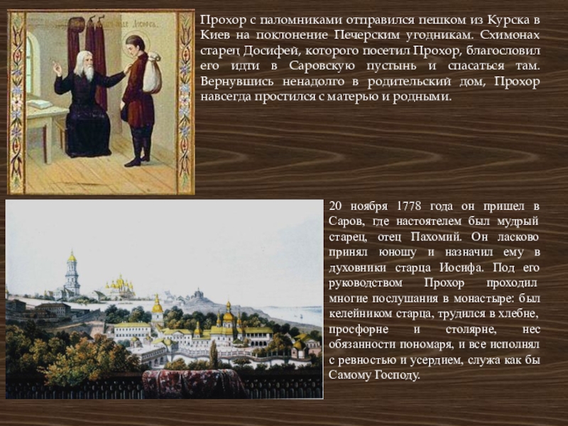 Печерским угодникам. Схимонах старец Досифей, которого посетил Прохор, благословил его идти в Саровскую пустынь и спасаться там. Вернувшись ненадолго в родительский дом, Прохор навсегда простился с матерью и родными.