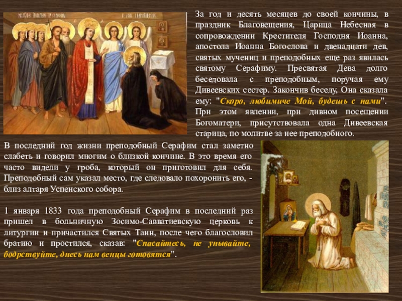 1 января 1833 года преподобный Серафим в последний раз пришел в больничную Зосимо-Савватиевскую церковь к литургии и причастился Святых Таин, после чего благословил братию и простился, сказав: "Спасайтесь, не унывайте, бодрствуйте, днесь нам венцы готовятся".