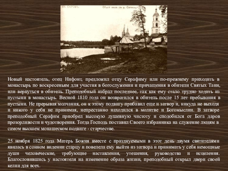 монастырь по воскресеньям для участия в богослужении и причащения в обители Святых Таин, или вернуться в обитель. Преподобный избрал последнее, так как ему стало трудно ходить из пустыни в монастырь. Весной 1810 года он возвратился в обитель после 15 лет пребывания в пустыни. Не прерывая молчания, он к этому подвигу прибавил еще и затвор и, никуда не выходя и никого у себя не принимая, непрестанно находился в молитве и Богомыслии. В затворе преподобный Серафим приобрел высокую душевную чистоту и сподобился от Бога даров прозорливости и чудотворения. Тогда Господь поставил Своего избранника на служение людям в самом высшем монашеском подвиге - старчестве.