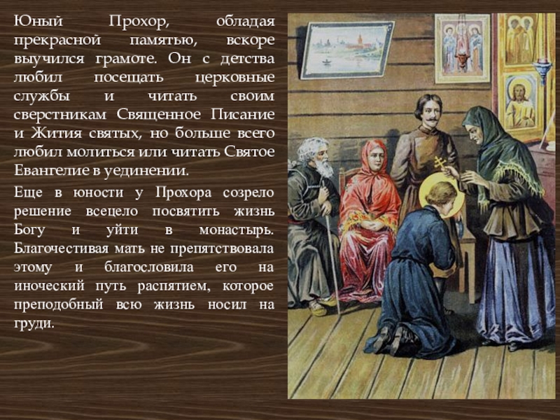 Слайд 5Юный Прохор, обладая прекрасной памятью, вскоре выучился грамоте. Он с детства