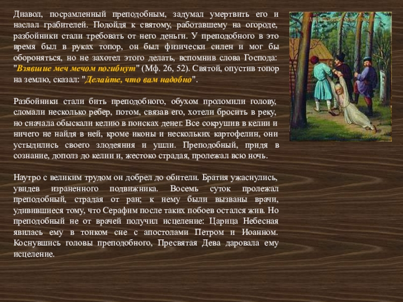 Слайд 13Диавол, посрамленный преподобным, задумал умертвить его и наслал грабителей. Подойдя к