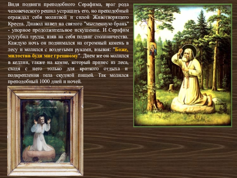 Слайд 12Видя подвиги преподобного Серафима, враг рода человеческого решил устрашать его, но