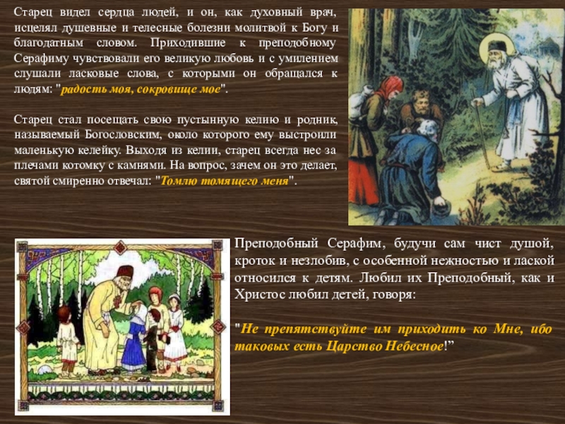 и телесные болезни молитвой к Богу и благодатным словом. Приходившие к преподобному Серафиму чувствовали его великую любовь и с умилением слушали ласковые слова, с которыми он обращался к людям: "радость моя, сокровище мое".