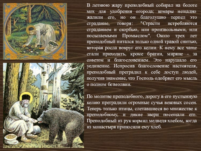 Слайд 11В летнюю жару преподобный собирал на болоте мох для удобрения огорода;