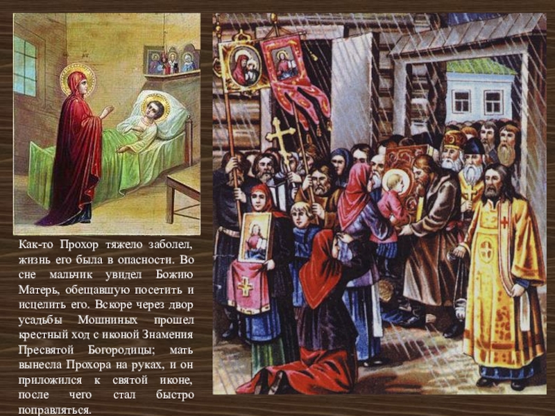 Слайд 4Как-то Прохор тяжело заболел, жизнь его была в опасности. Во сне