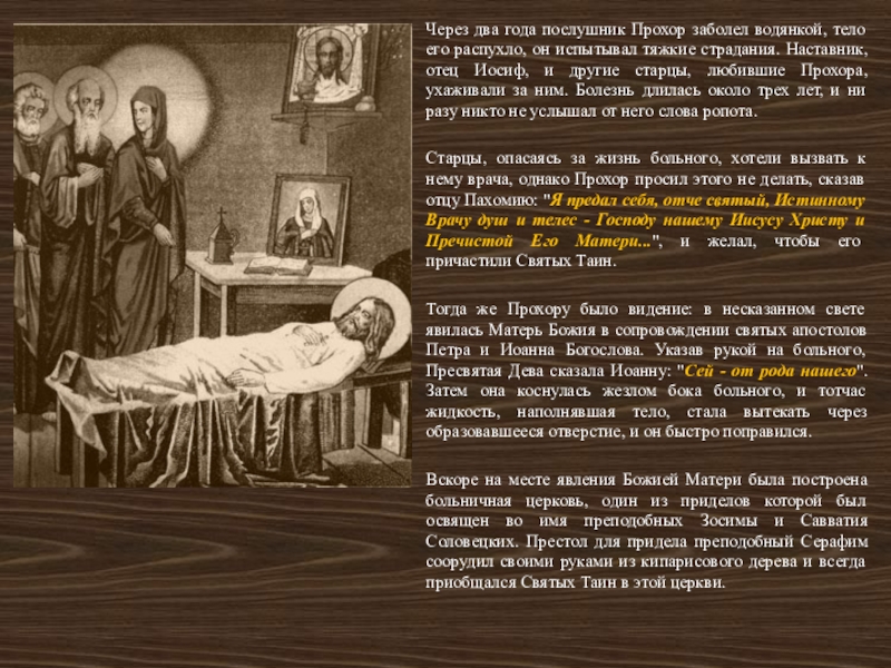 Слайд 8Через два года послушник Прохор заболел водянкой, тело его распухло, он