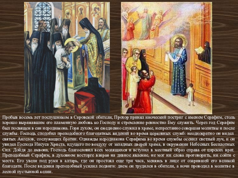 с именем Серафим, столь хорошо выражавшим его пламенную любовь ко Господу и стремление ревностно Ему служить. Через год Серафим был посвящен в сан иеродиакона. Горя духом, он ежедневно служил в храме, непрестанно совершая молитвы и после службы. Господь сподобил преподобного благодатных видений во время церковных служб: неоднократно он видел святых Ангелов, сослужащих братии. Однажды иеродиакона Серафима во время службы осенил светлый луч, и он увидел Господа Иисуса Христа, идущего по воздуху от западных дверей храма, в окружении Небесных Бесплотных Сил. Дойдя до амвона, Господь благословил всех молящихся и вступил в местный образ справа от царских врат. Преподобный Серафим, в духовном восторге взирая на дивное явление, не мог ни слова проговорить, ни сойти с места. Его увели под руки в алтарь, где он простоял еще три часа, меняясь в лице от озарившей его великой благодати. После видения преподобный усилил подвиги: днем он трудился в обители, а ночи проводил в молитве в лесной пустынной келии.