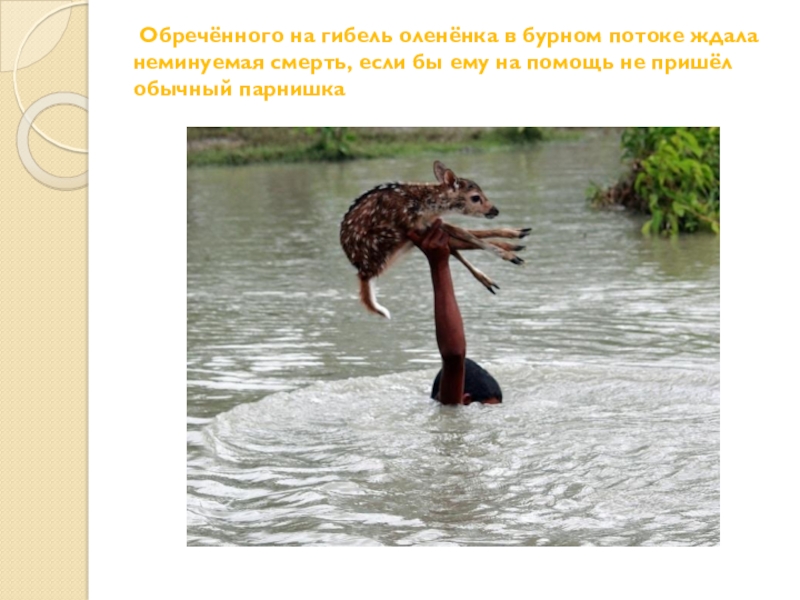 Слайд 12 Обречённого на гибель оленёнка в бурном потоке ждала неминуемая смерть, если