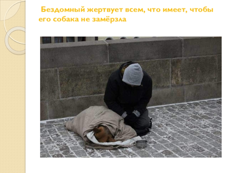 Слайд 14 Бездомный жертвует всем, что имеет, чтобы его собака не замёрзла