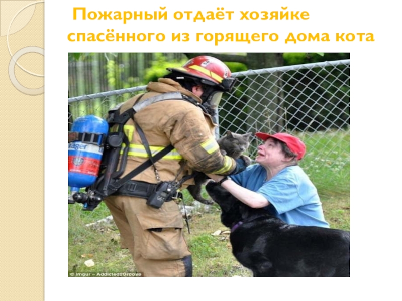 Слайд 5 Пожарный отдаёт хозяйке спасённого из горящего дома кота