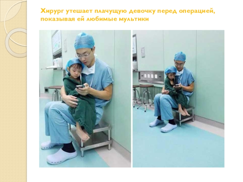 Слайд 7Хирург утешает плачущую девочку перед операцией, показывая ей любимые мультики