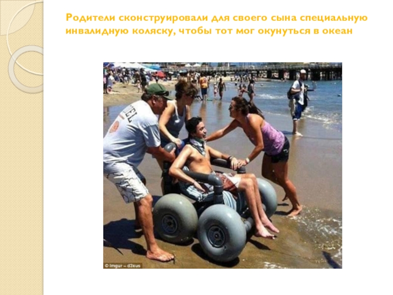 Слайд 13Родители сконструировали для своего сына специальную инвалидную коляску, чтобы тот мог