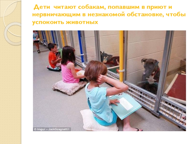 Слайд 6 Дети читают собакам, попавшим в приют и нервничающим в незнакомой