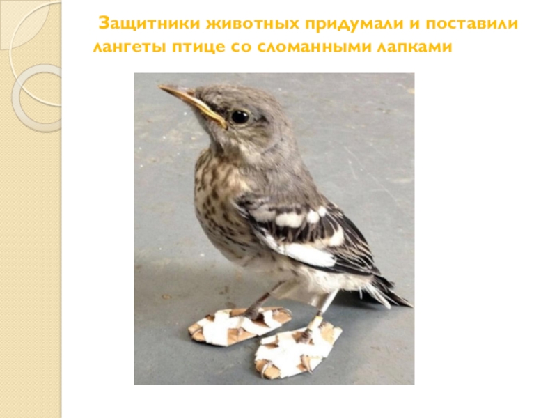 Слайд 9 Защитники животных придумали и поставили лангеты птице со сломанными лапками