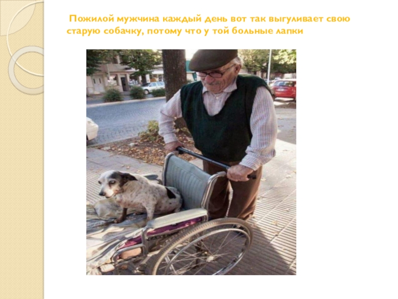 Слайд 8 Пожилой мужчина каждый день вот так выгуливает свою старую собачку, потому