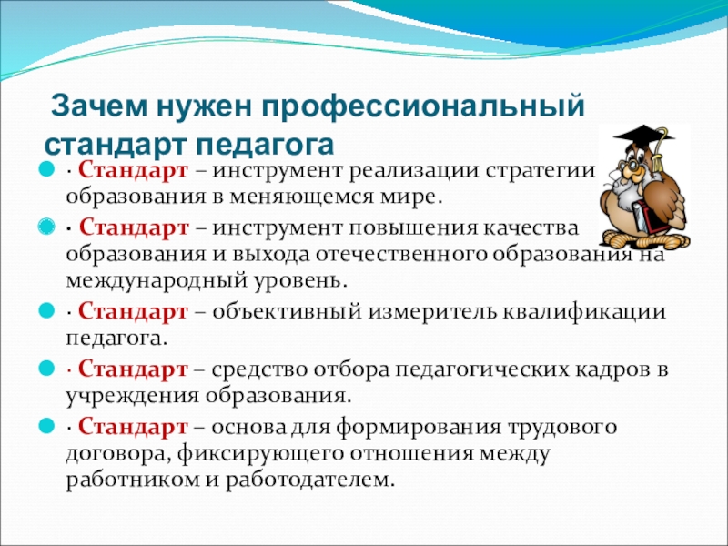 · Стандарт – средство отбора педагогических кадров в учреждения образования.