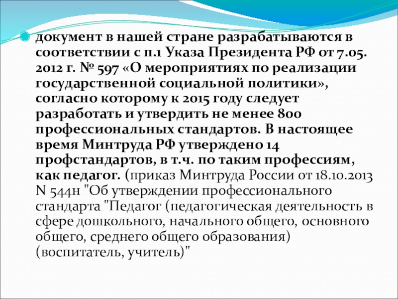 РФ от 7.05. 2012 г. № 597 «О мероприятиях по реализации государственной социальной политики», согласно которому к 2015 году следует разработать и утвердить не менее 800 профессиональных стандартов. В настоящее время Минтруда РФ утверждено 14 профстандартов, в т.ч. по таким профессиям, как педагог. (приказ Минтруда России от 18.10.2013 N 544н "Об утверждении профессионального стандарта "Педагог (педагогическая деятельность в сфере дошкольного, начального общего, основного общего, среднего общего образования) (воспитатель, учитель)"