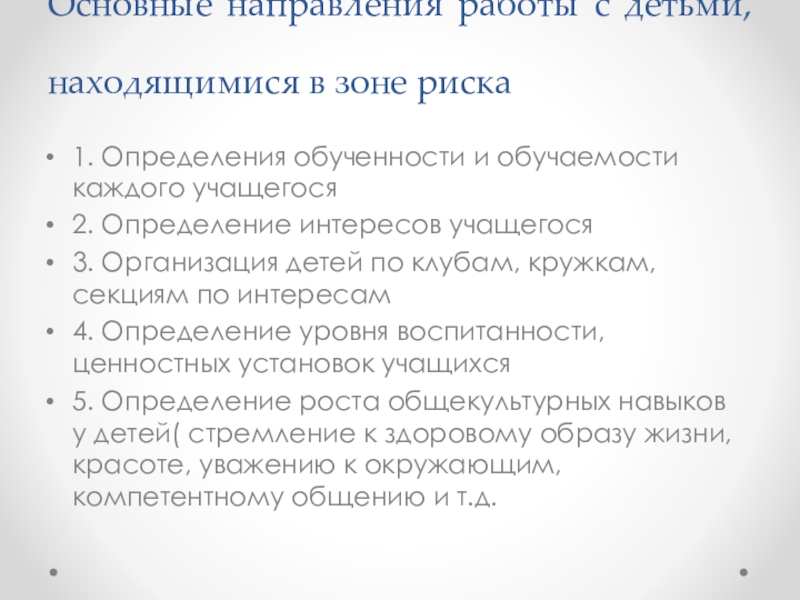Основные направления работы с детьми, находящимися в зоне риска1. Определения обученности и обучаемости каждого учащегося2. Определение интересов