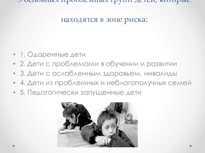 5 основных проблемных групп детей, которые находятся в зоне риска:1. Одаренные дети2. Дети с проблемами в обучении