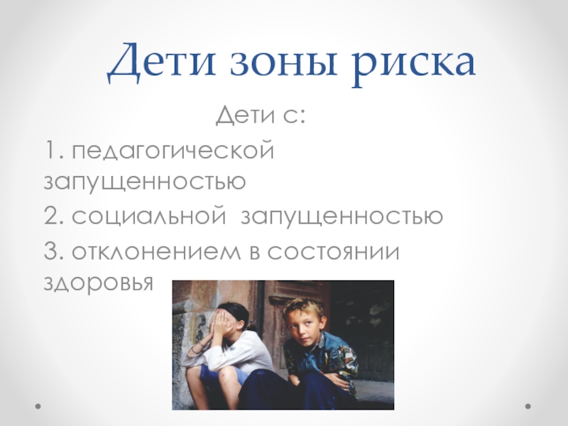 Дети зоны рискаДети с:1. педагогической запущенностью2. социальной запущенностью3. отклонением в состоянии здоровья