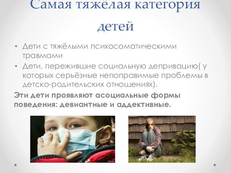 Самая тяжёлая категория детейДети с тяжёлыми психосоматическими травмамиДети, пережившие социальную депривацию( у которых серьёзные непоправимые проблемы в