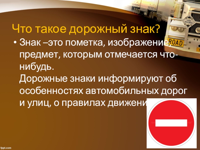 Знак –это пометка, изображение, предмет, которым отмечается что-нибудь. Дорожные
