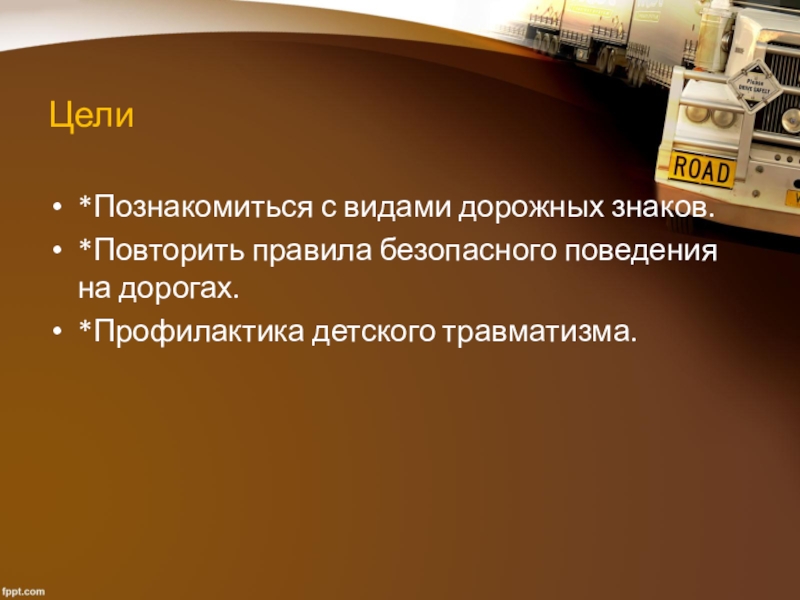 Цели*Познакомиться с видами дорожных знаков.*Повторить правила безопасного поведения на дорогах.*Профилактика детского травматизма.