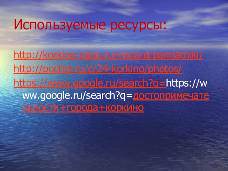 Используемые ресурсы:http://korkino-raion.ru/viscard/pamjatniki/http://pochel.ru/c/24-korkino/photos/https://www.google.ru/search?q=https://www.google.ru/search?q=достопримечательности+города+коркино
