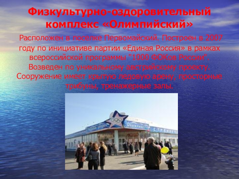 Слайд 7Физкультурно-оздоровительный комплекс «Олимпийский» Расположен в поселке Первомайский. Построен в 2007 году