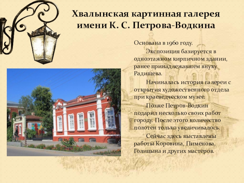 Экспозиция включает работы Сурикова, Репина, Малевича и других мастеров. Имеется обширная библиотека, где есть старинные книги об искусстве.
