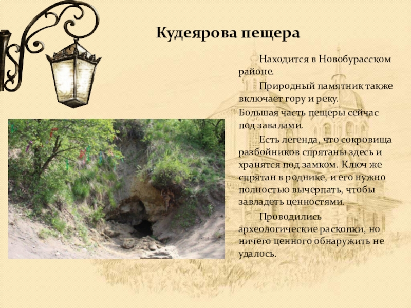 Есть легенда, что сокровища разбойников спрятаны здесь и хранятся под замком. Ключ же спрятан в роднике, и его нужно полностью вычерпать, чтобы завладеть ценностями.