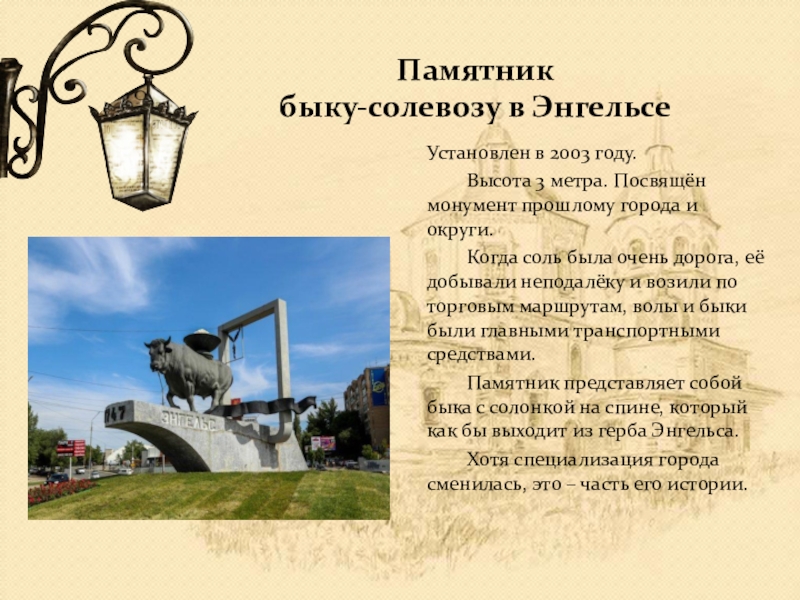 Памятник представляет собой быка с солонкой на спине, который как бы выходит из герба Энгельса.