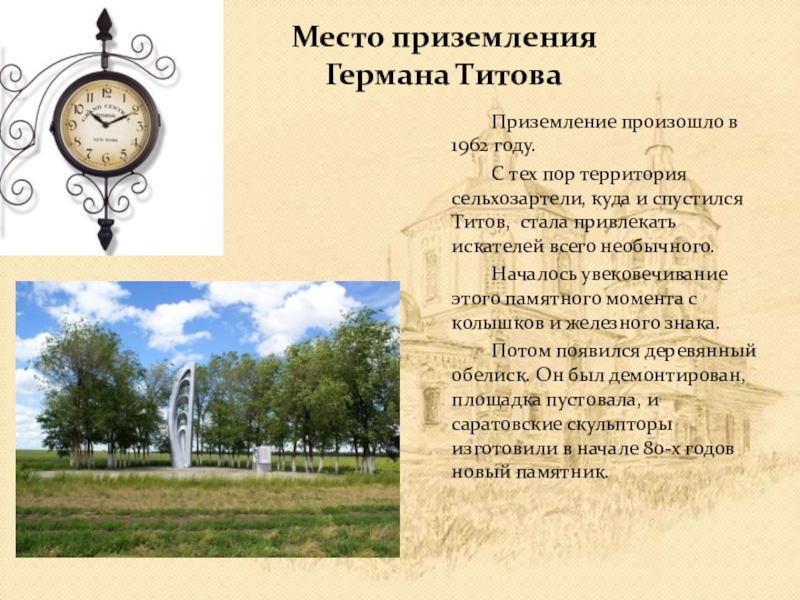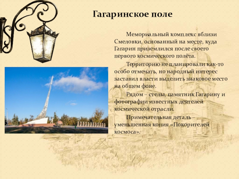 после своих космических полётов Гагарин и Титов. Эти в прошлом обычные места, теперь увековечены мемориальными комплексами, пусть и небольшими.