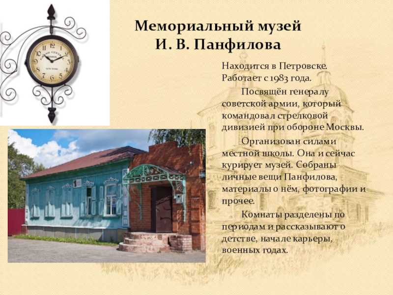 Организован силами местной школы. Она и сейчас курирует музей. Собраны личные вещи Панфилова, материалы о нём, фотографии и прочее.
