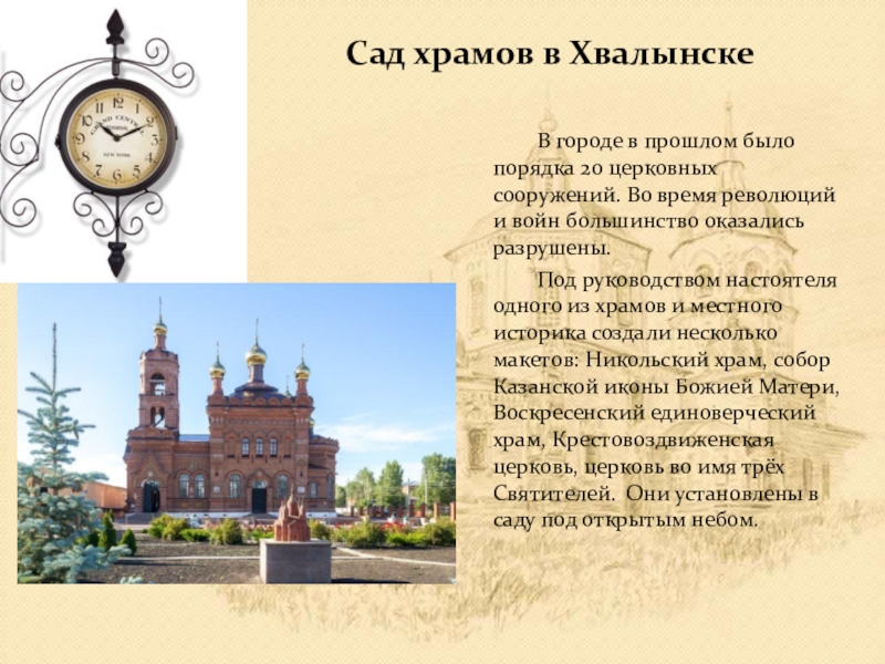 Под руководством настоятеля одного из храмов и местного историка создали несколько макетов: Никольский храм, собор Казанской иконы Божией Матери, Воскресенский единоверческий храм, Крестовоздвиженская церковь, церковь во имя трёх Святителей. Они установлены в саду под открытым небом.