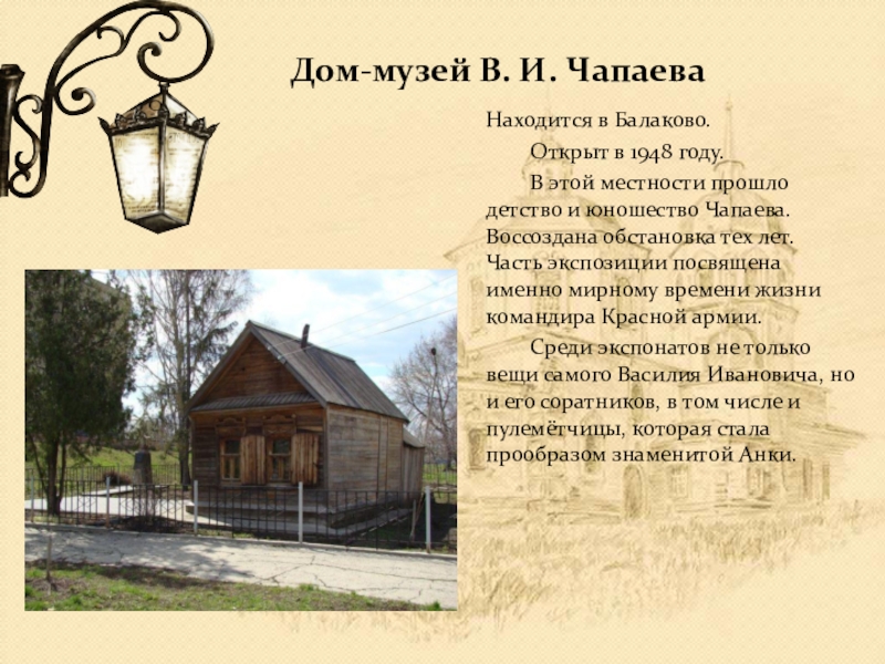 этой местности прошло детство и юношество Чапаева. Воссоздана обстановка тех лет. Часть экспозиции посвящена именно мирному времени жизни командира Красной армии.