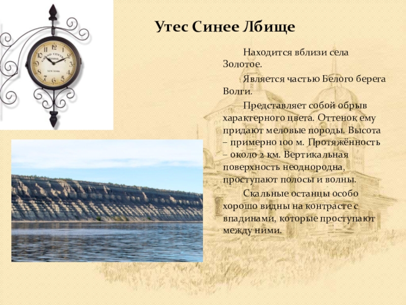 Представляет собой обрыв характерного цвета. Оттенок ему придают меловые породы. Высота – примерно 100 м. Протяжённость – около 2 км. Вертикальная поверхность неоднородна, проступают полосы и волны.