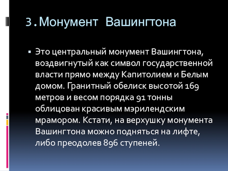 между Капитолием и Белым домом. Гранитный обелиск высотой 169 метров и весом порядка 91 тонны облицован красивым мэрилендским мрамором. Кстати, на верхушку монумента Вашингтона можно подняться на лифте, либо преодолев 896 ступеней.