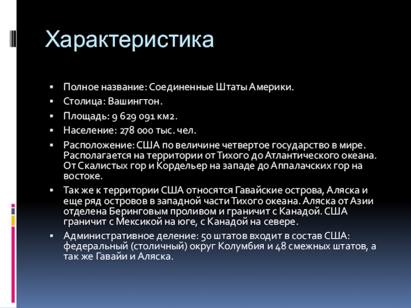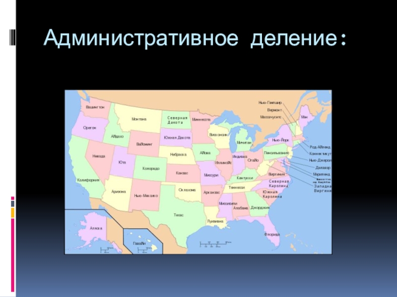 Административное деление: 50 штатов входит в состав США: федеральный (столичный) округ Колумбия и 48 смежных штатов, а так же Гавайи и Аляска.