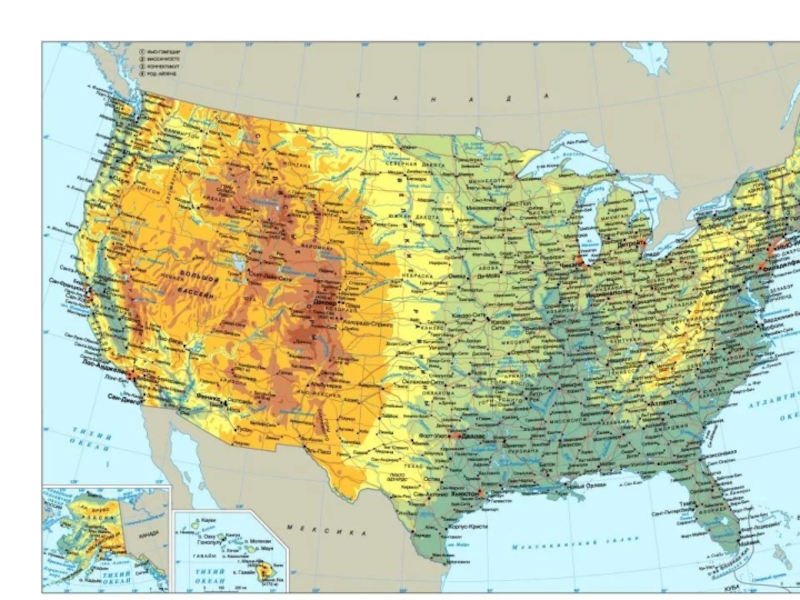 Так же к территории США относятся Гавайские острова, Аляска и еще ряд островов в западной части Тихого океана. Аляска от Азии отделена Беринговым проливом и граничит с Канадой. США граничит с Мексикой на юге, с Канадой на севере.