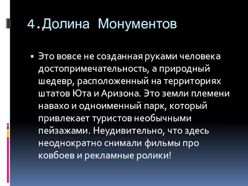 расположенный на территориях штатов Юта и Аризона. Это земли племени навахо и одноименный парк, который привлекает туристов необычными пейзажами. Неудивительно, что здесь неоднократно снимали фильмы про ковбоев и рекламные ролики!
