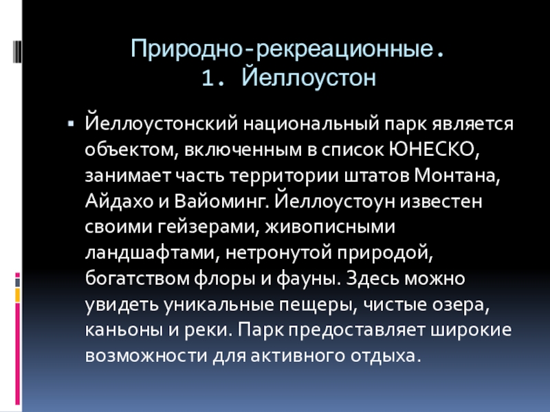 в список ЮНЕСКО, занимает часть территории штатов Монтана, Айдахо и Вайоминг. Йеллоустоун известен своими гейзерами, живописными ландшафтами, нетронутой природой, богатством флоры и фауны. Здесь можно увидеть уникальные пещеры, чистые озера, каньоны и реки. Парк предоставляет широкие возможности для активного отдыха.
