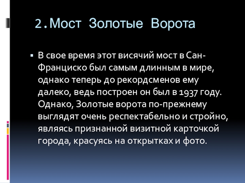 был самым длинным в мире, однако теперь до рекордсменов ему далеко, ведь построен он был в 1937 году. Однако, Золотые ворота по-прежнему выглядят очень респектабельно и стройно, являясь признанной визитной карточкой города, красуясь на открытках и фото.