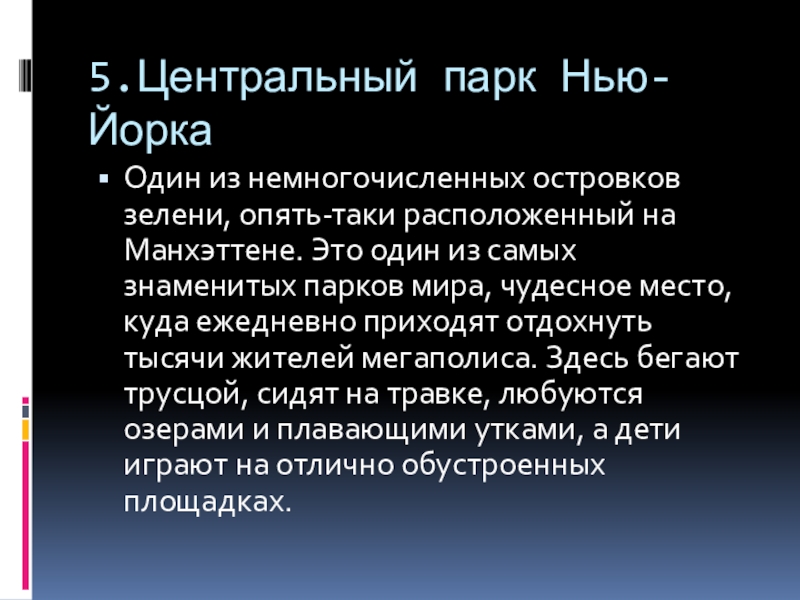 Это один из самых знаменитых парков мира, чудесное место, куда ежедневно приходят отдохнуть тысячи жителей мегаполиса. Здесь бегают трусцой, сидят на травке, любуются озерами и плавающими утками, а дети играют на отлично обустроенных площадках.