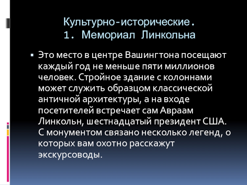 меньше пяти миллионов человек. Стройное здание с колоннами может служить образцом классической античной архитектуры, а на входе посетителей встречает сам Авраам Линкольн, шестнадцатый президент США. С монументом связано несколько легенд, о которых вам охотно расскажут экскурсоводы.