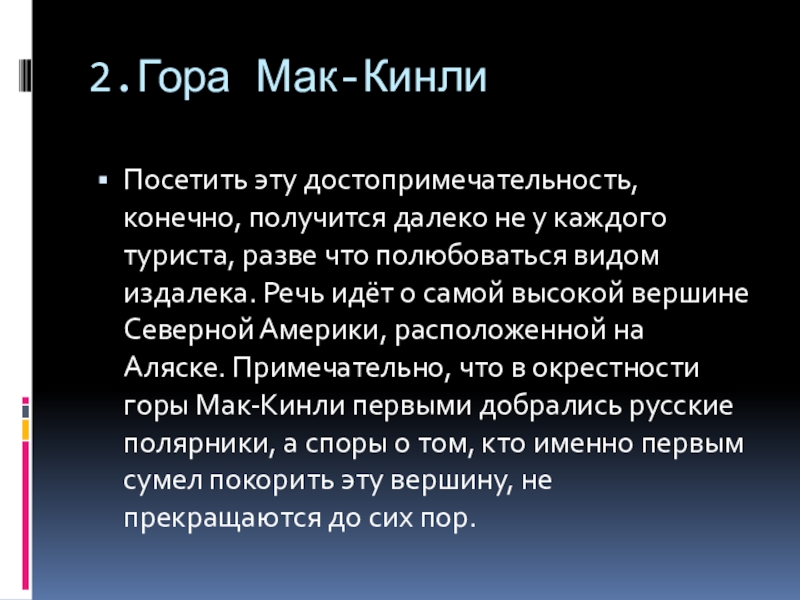 разве что полюбоваться видом издалека. Речь идёт о самой высокой вершине Северной Америки, расположенной на Аляске. Примечательно, что в окрестности горы Мак-Кинли первыми добрались русские полярники, а споры о том, кто именно первым сумел покорить эту вершину, не прекращаются до сих пор.